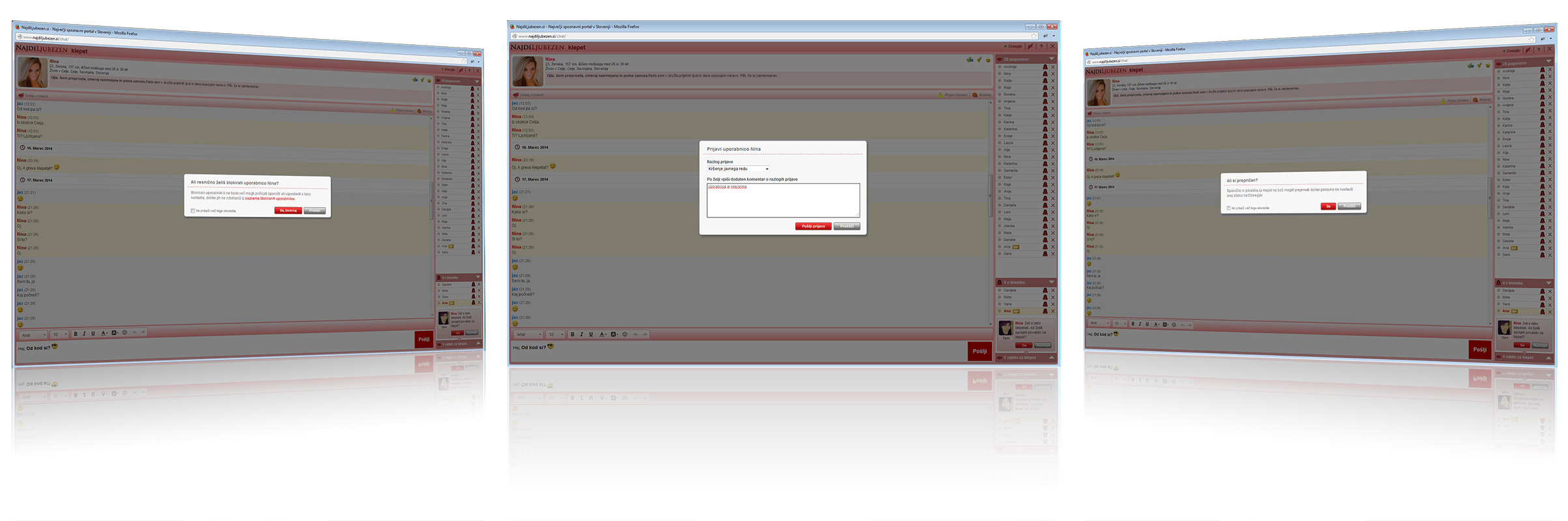 Ti kakšen uporabnik teži in te ne pusti pri miru? Na NajdiLjubezen klepetu lahko uporabnika blokiraš ali pa ga prijaviš ekipi NajdiLjubezen le z enim klikom miške. NajdiLjubezen ekipa bo primer preučila